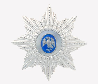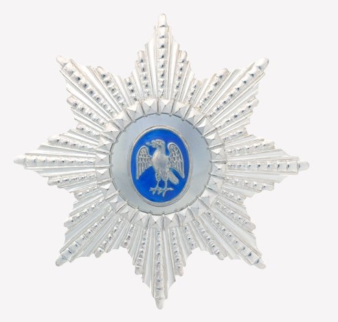 The next class above Commander's Cross is Commander's Cross with Star. The Star is an eight-pointed silver star, and in its center is a blue-enamelled silver shield bearing the silver falcon. A Commander of this class wears the Cross around the neck and the Star on the left side of the chest.