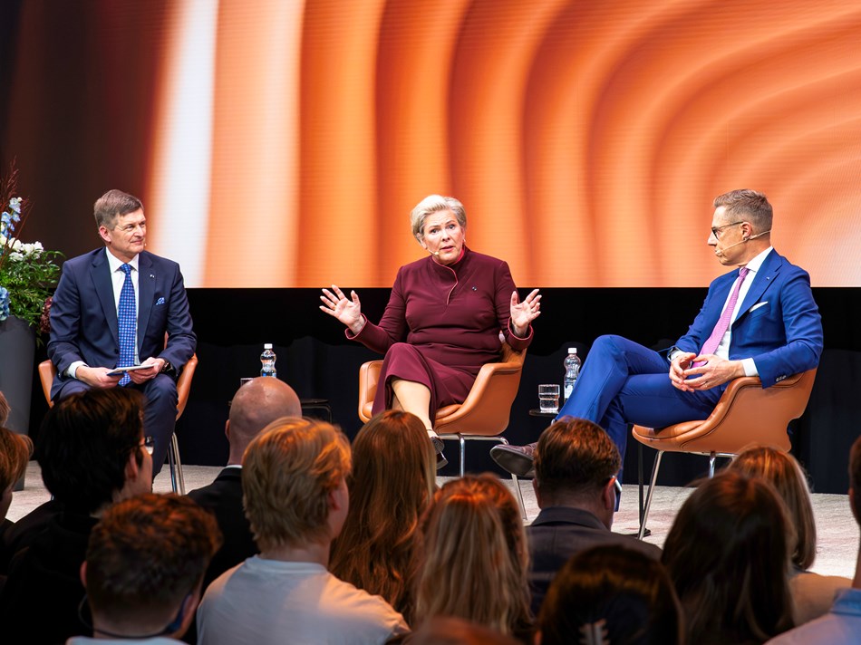 Eftir hádegi heimsóttu forsetarnir, fylgdarlið þeirra og viðskiptasendinefndin Aalto-háskólann í Espoo en þar ræddu Alexander Stubb og Halla Tómasdóttir, ásamt Ilkka Niemelä rektor skólans, við nemendur um hlutverk leiðtoga á tímum óreiðu í alþjóðakerfinu.