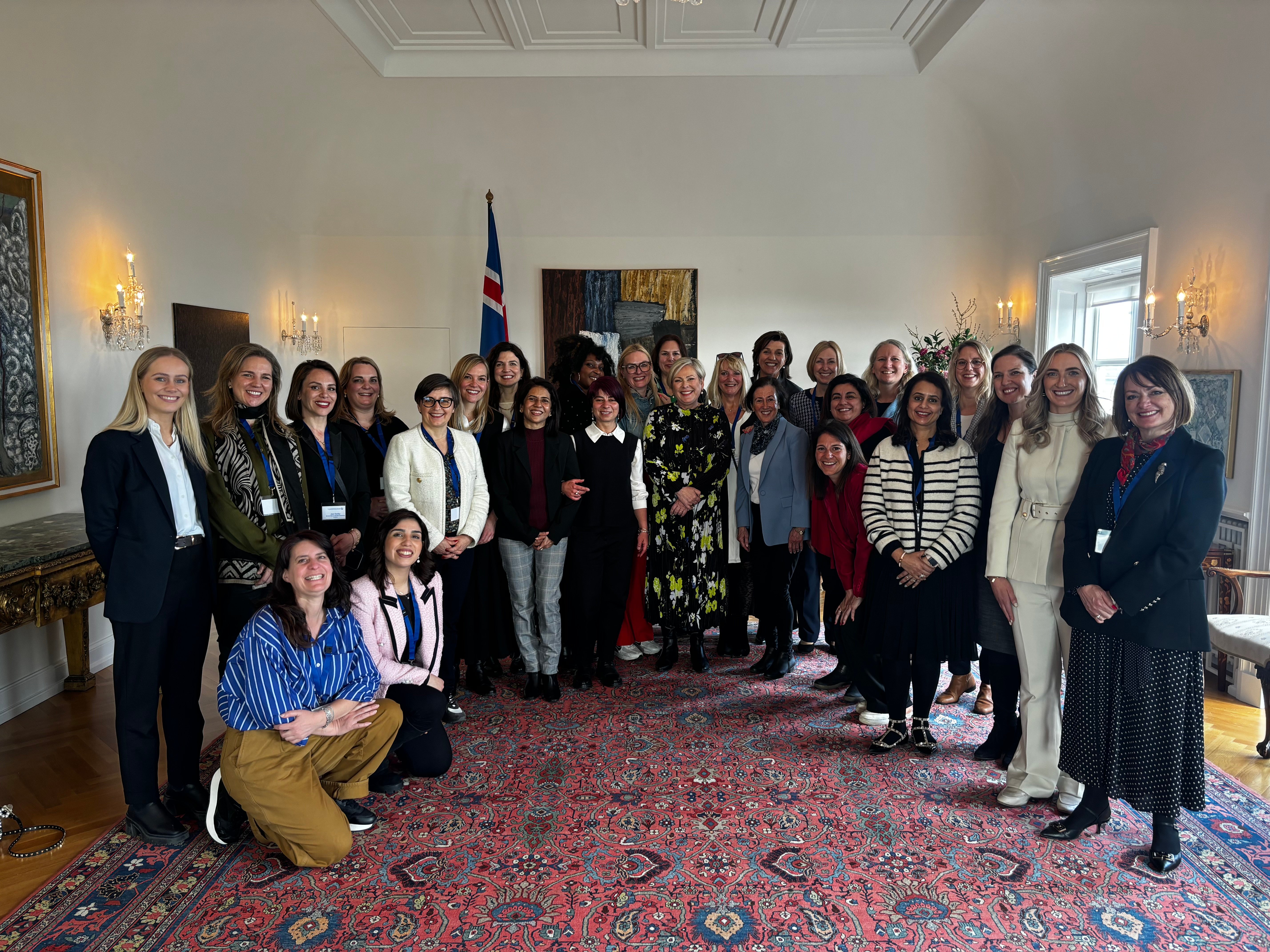 Forseti tekur á móti alþjóðlegum hópi kvenleiðtoga á Bessastöðum.