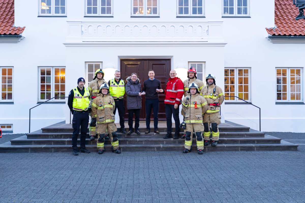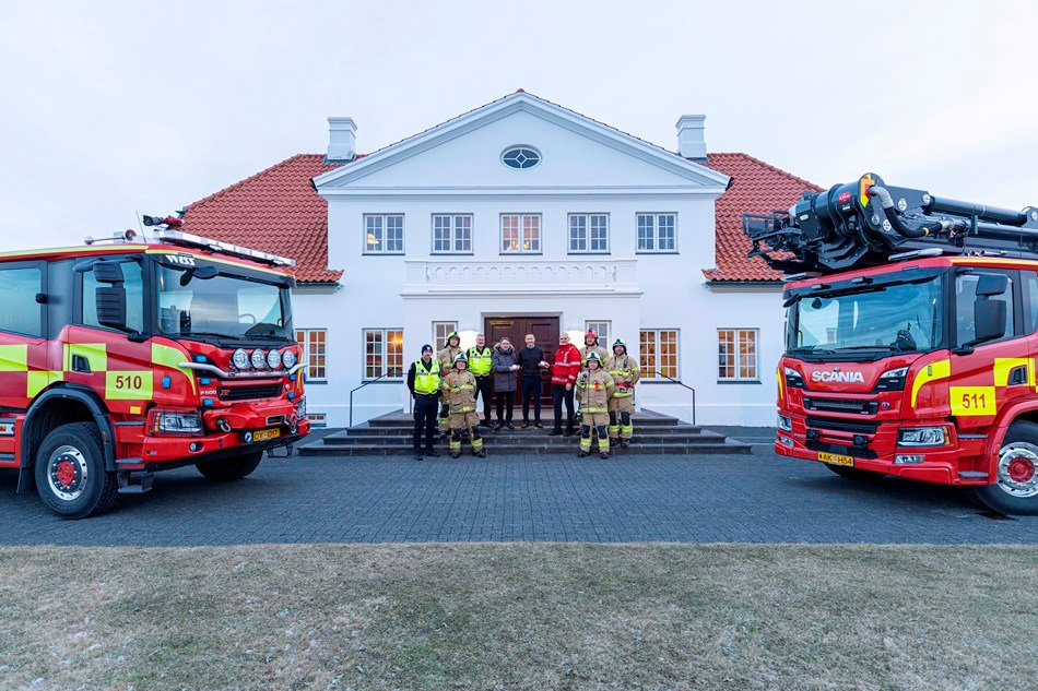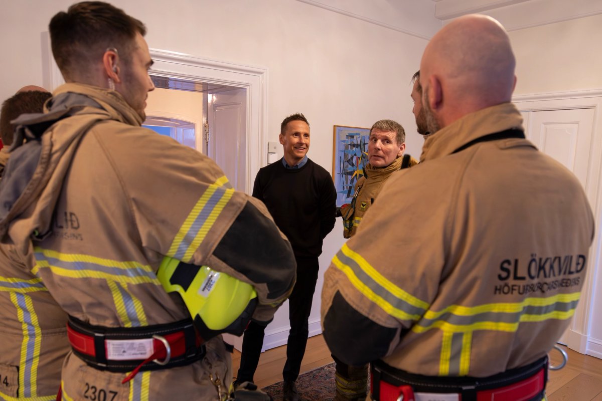 Slökkviliðið og HMS komu færandi hendi með reykskynjara að gjöf til forsetahjóna, auk þess sem slökkviliðsmenn ræddu við Björn um mikilvægi eldvarna á heimilum landsins, þar á meðal á Bessastöðum.
