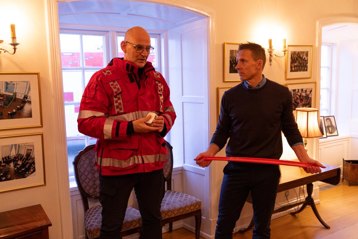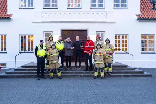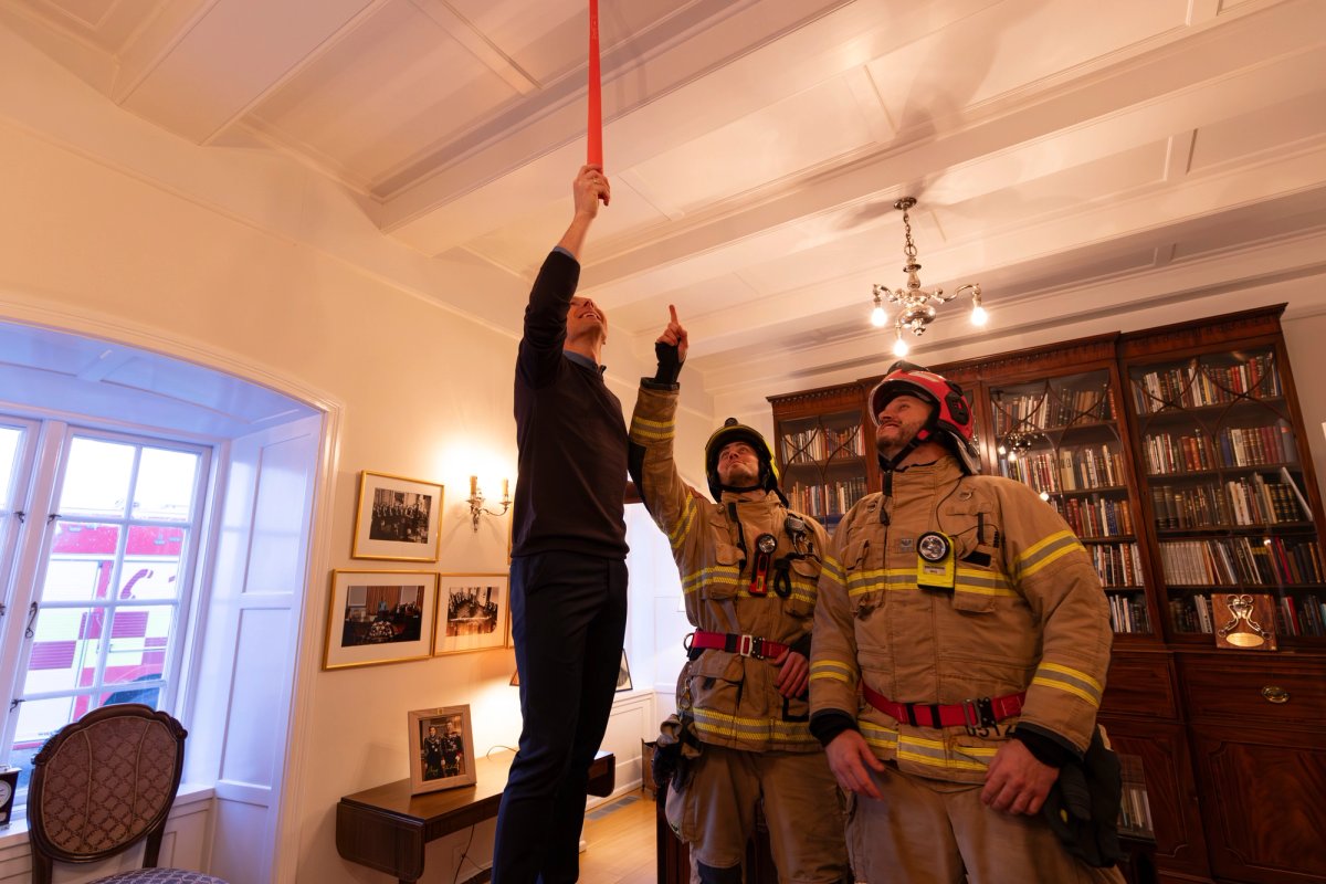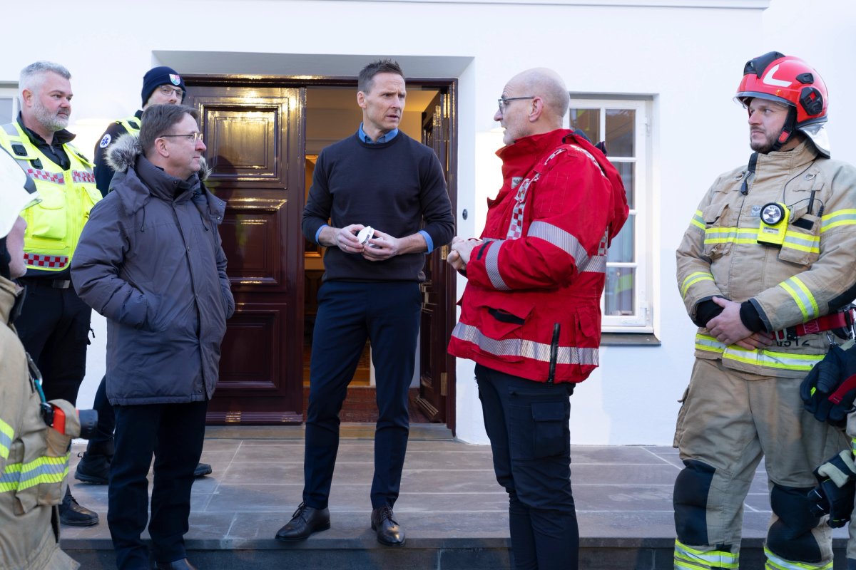Björn Skúlason, eiginmaður forseta tekur á móti Jóni Viðari Matthíassyni slökkviliðsstjóra og Hermanni Jónassyni, forstjóra Húsnæðis og mannvirkjastofnunar (HMS), auk slökkviliðsmanna frá slökkviliði höfuðborgarsvæðisins. Tilefnið er dagur reykskynjarans þann 1. desember og forvarnarátak sem stofnanirnar taka árlega höndum saman um í tengslum við daginn.