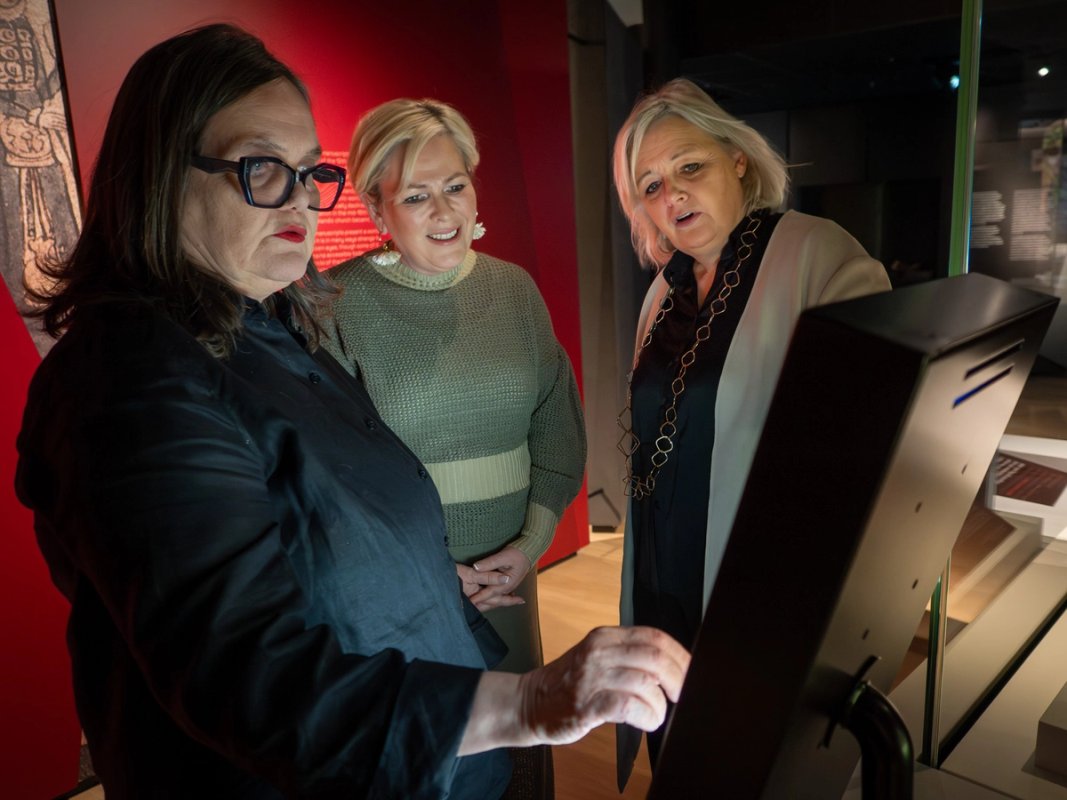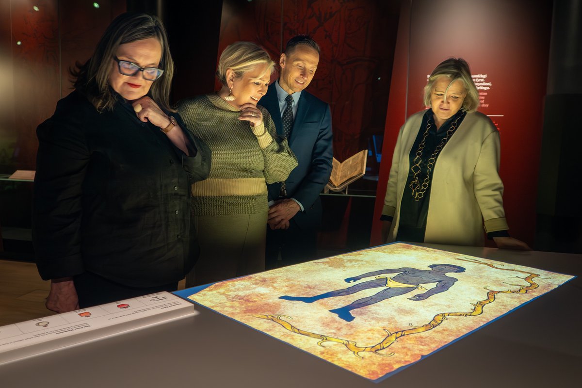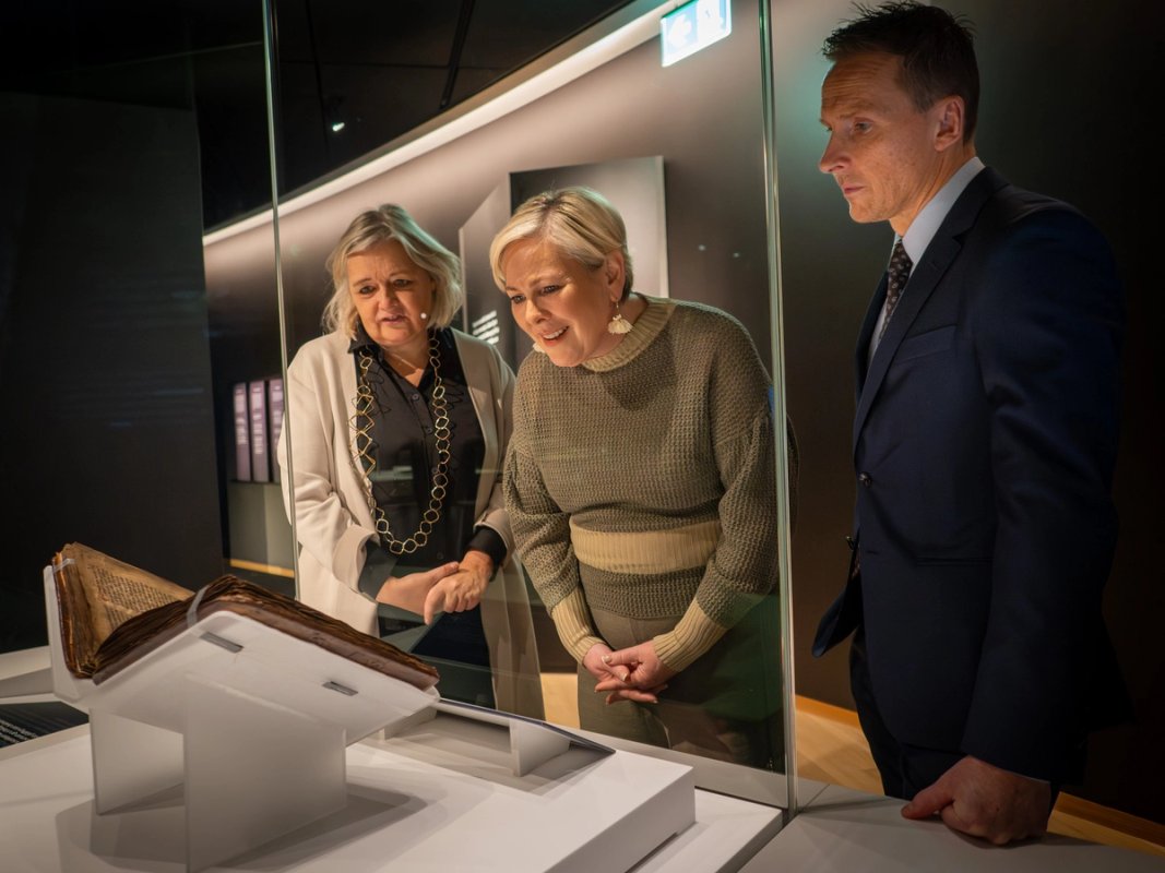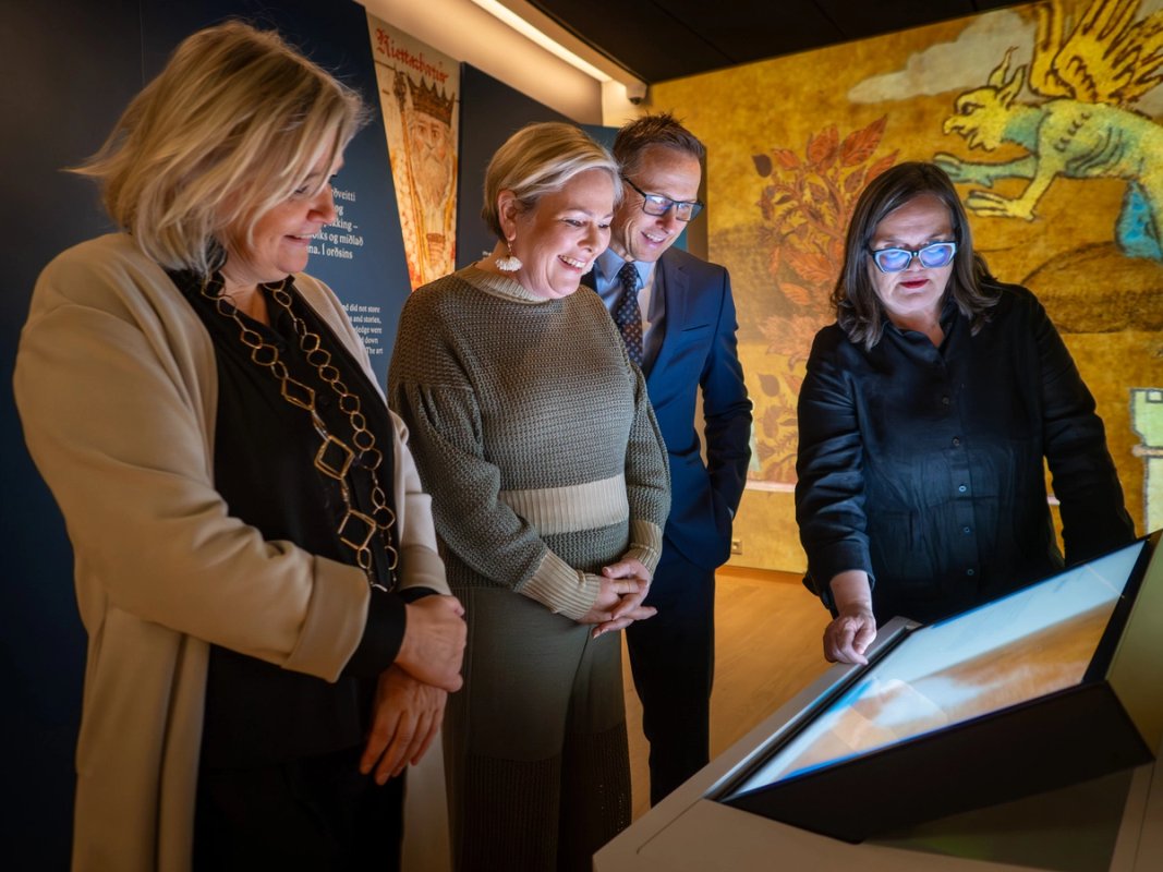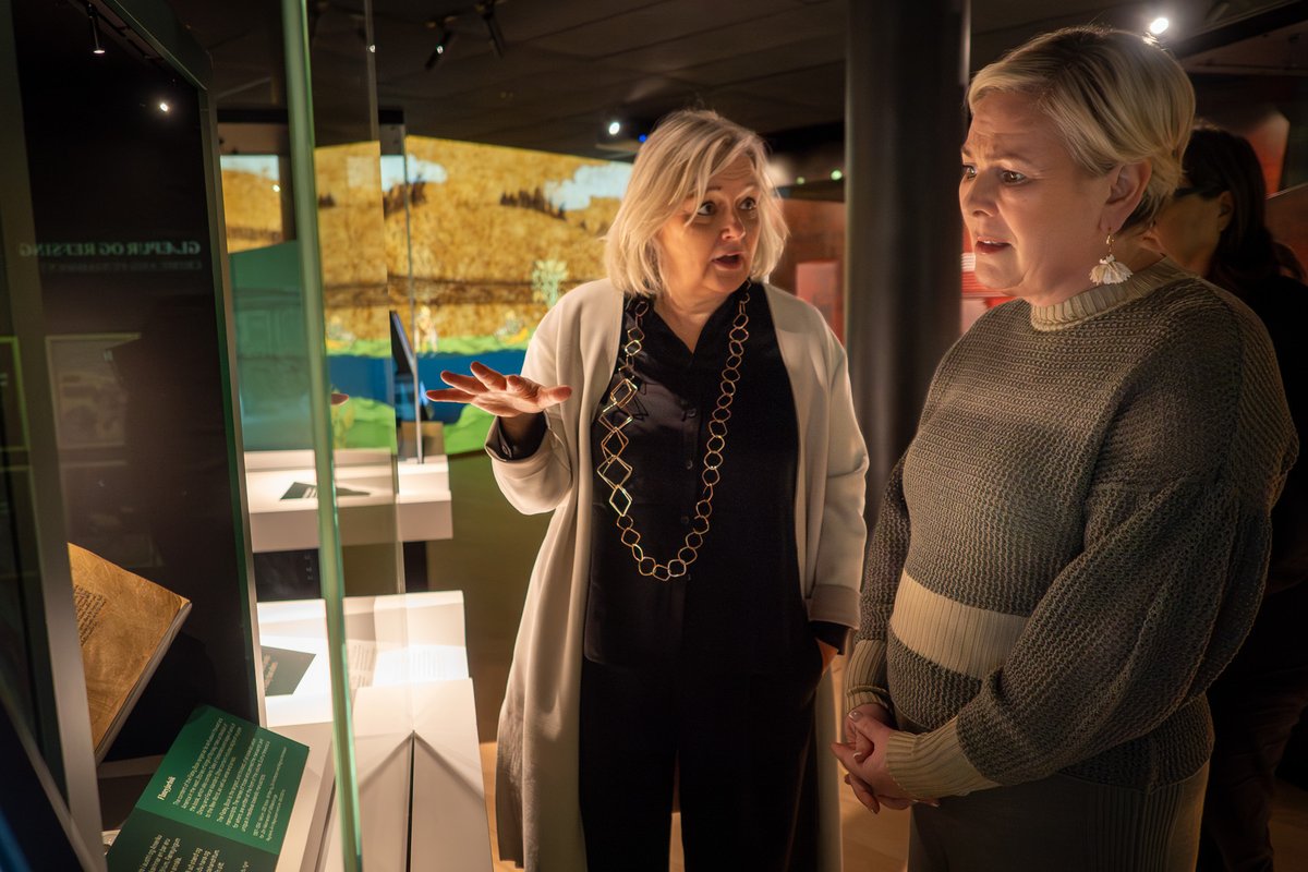 Guðrún Nordal, forstöðumaður Stofnunar Árna Magnússonar, og Sigrún Kristjánsdóttir sýningarstjóri tóku á móti forsetahjónum og fræddu þau um handritin og framsetningu þeirra á sýningunni.