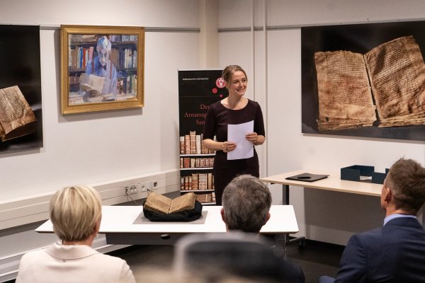 Annette Lassen rannsóknarprófessor fræðir forsetahjón og konungshjónin um sagnaarfinn sem handritasafn Árna Magnússonar hefur að geyma. Ljósmynd: Mads Frost