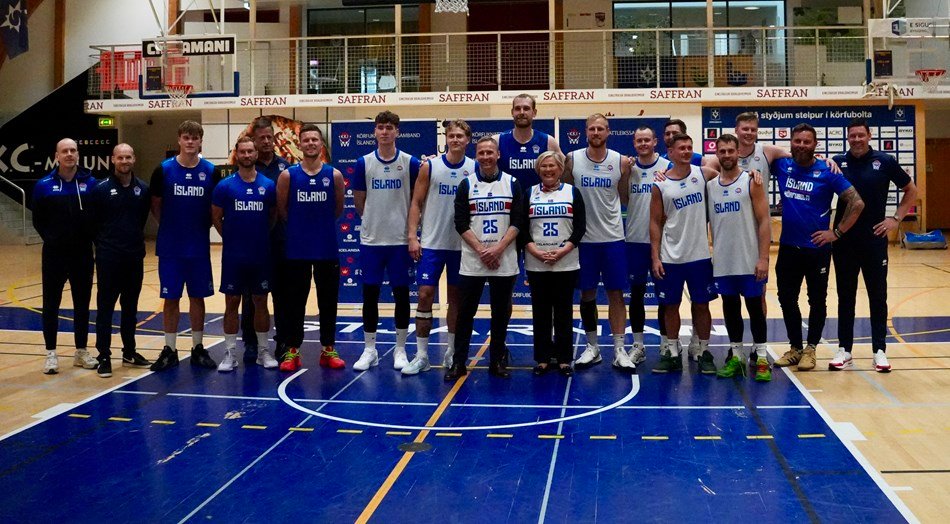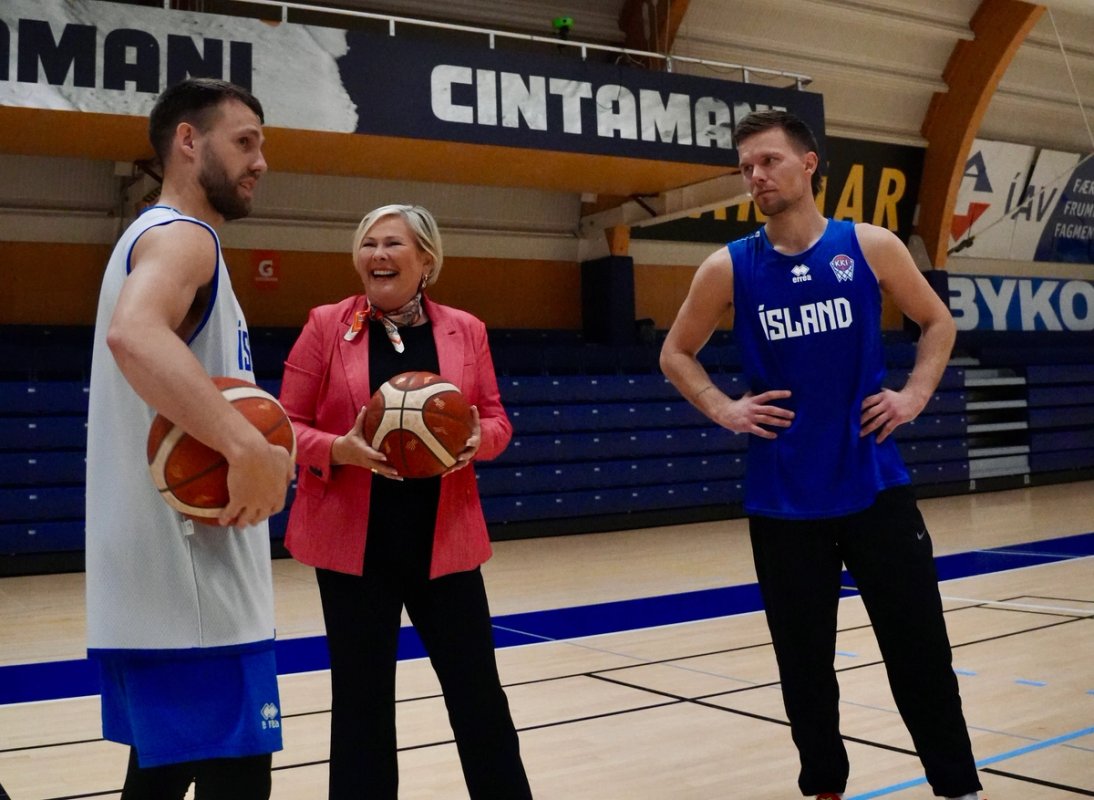 Íslenska karlalandsliðiðið býr sig þessa dagana undir þátttöku í lokamóti EuroBasket 2025. Forsetahjón litu inn á lokaæfingu liðsins í íþróttahúsinu Ásgarði. Þau fengu landsliðstreyjur að gjöf og í kjölfarið ávarpaði forseti landsliðshópinn. Hún hvatti leikmenn til að spila með hjartanu og sagði að oft væri það jákvætt fyrir okkur Íslendinga að eiga á brattann að sækja. Slíkt framkallaði þegar best léti aukna seiglu og sveigjanleika. Hún bað leikmenn líka að muna, ef eitthvað vantaði upp á andann, hvað körfuboltinn gerði fyrir Grindvíkinga í kjölfar jarðhræringanna á Reykjanesi. „Körfuboltinn náði þar að sameina heilt samfélag og sennilega að bjarga sál þeirra og samfélagi á tímum þegar kannski fátt annað gat gert það.“