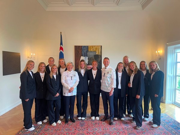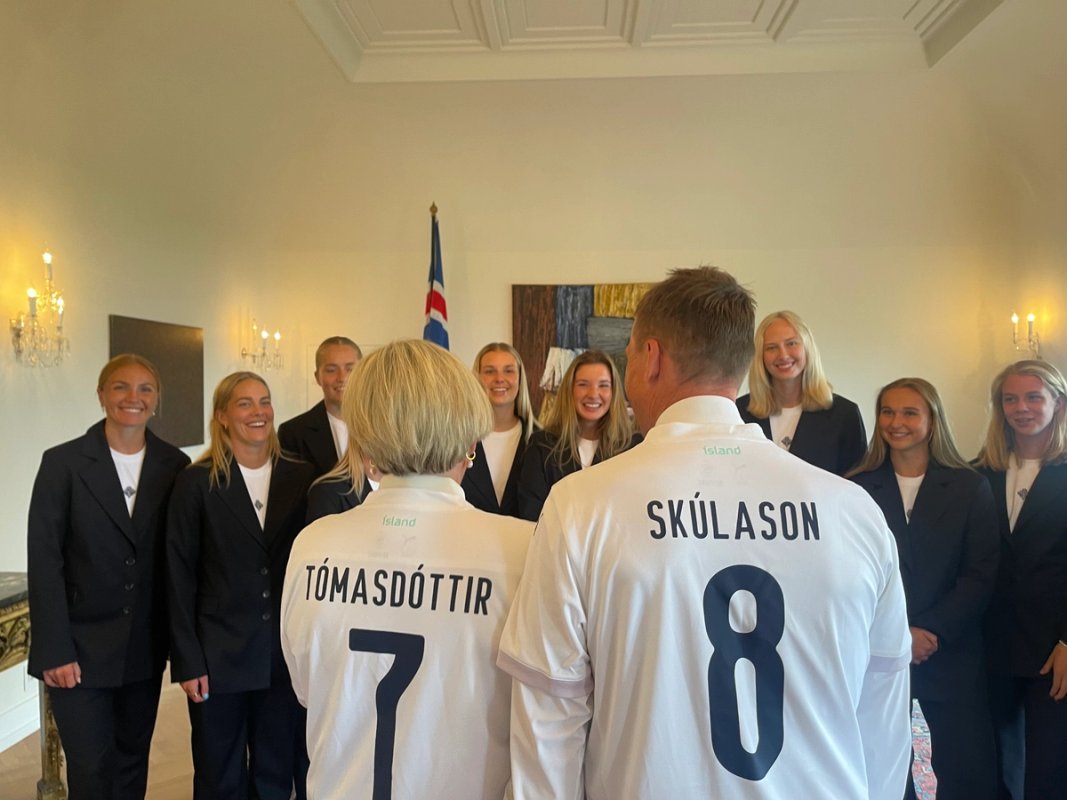 Forsetahjón taka á móti kvennalandsliðinu í knattspyrnu á Bessastöðum. Liðið færði þeim landsliðstreyjur fyrir EM kvenna í knattspyrnu sem hefst í Sviss í byrjun júlí.