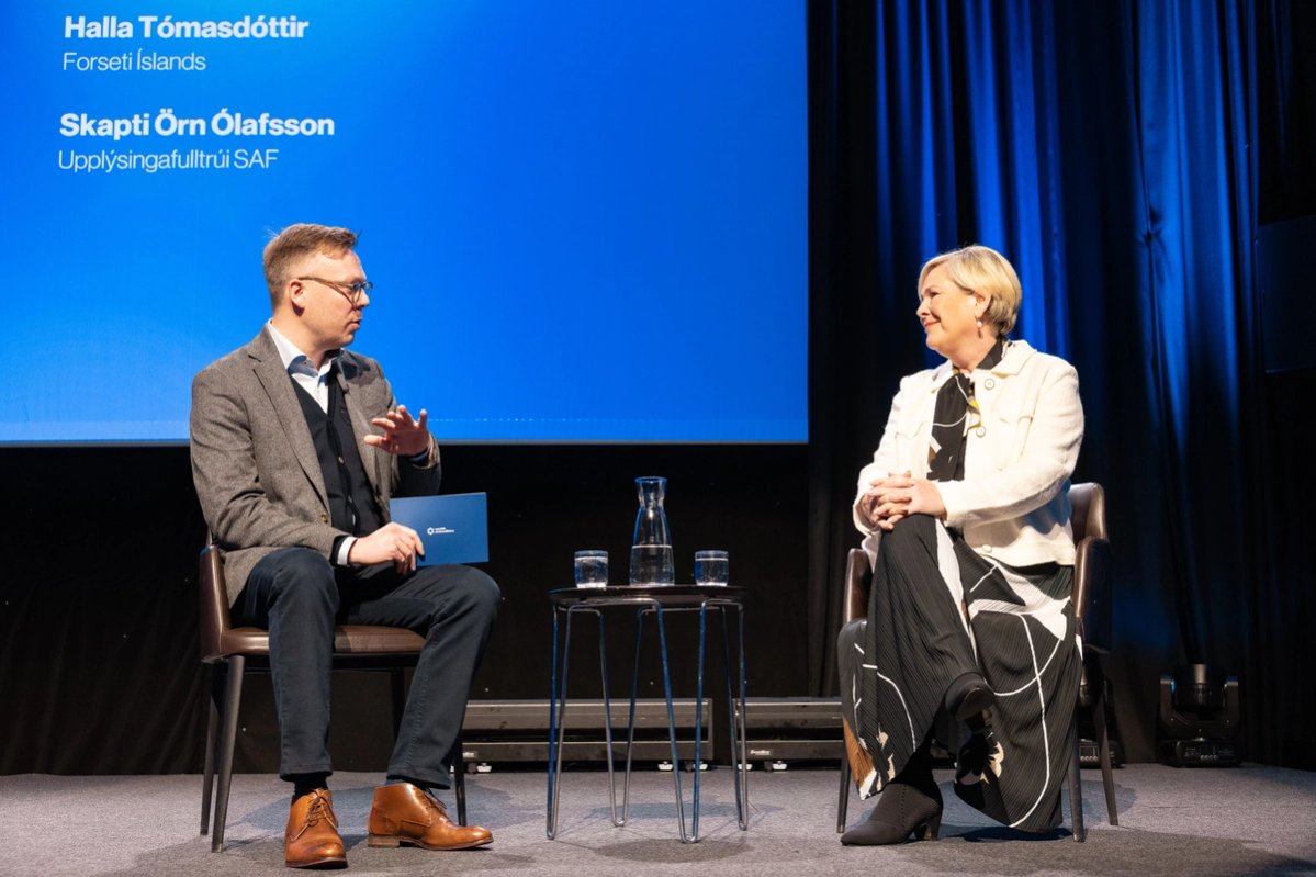 Dagskráin var opnuð með arinspjalli þar sem Skapti Örn Ólafsson, upplýsingafulltrúi Samtaka ferðaþjónustunnar, ræddi við forseta um þróun menntunar í atvinnulífinu með hliðsjón af tækniframförum, breytingum á vinnumarkaði og samkeppnishæfni Íslands.