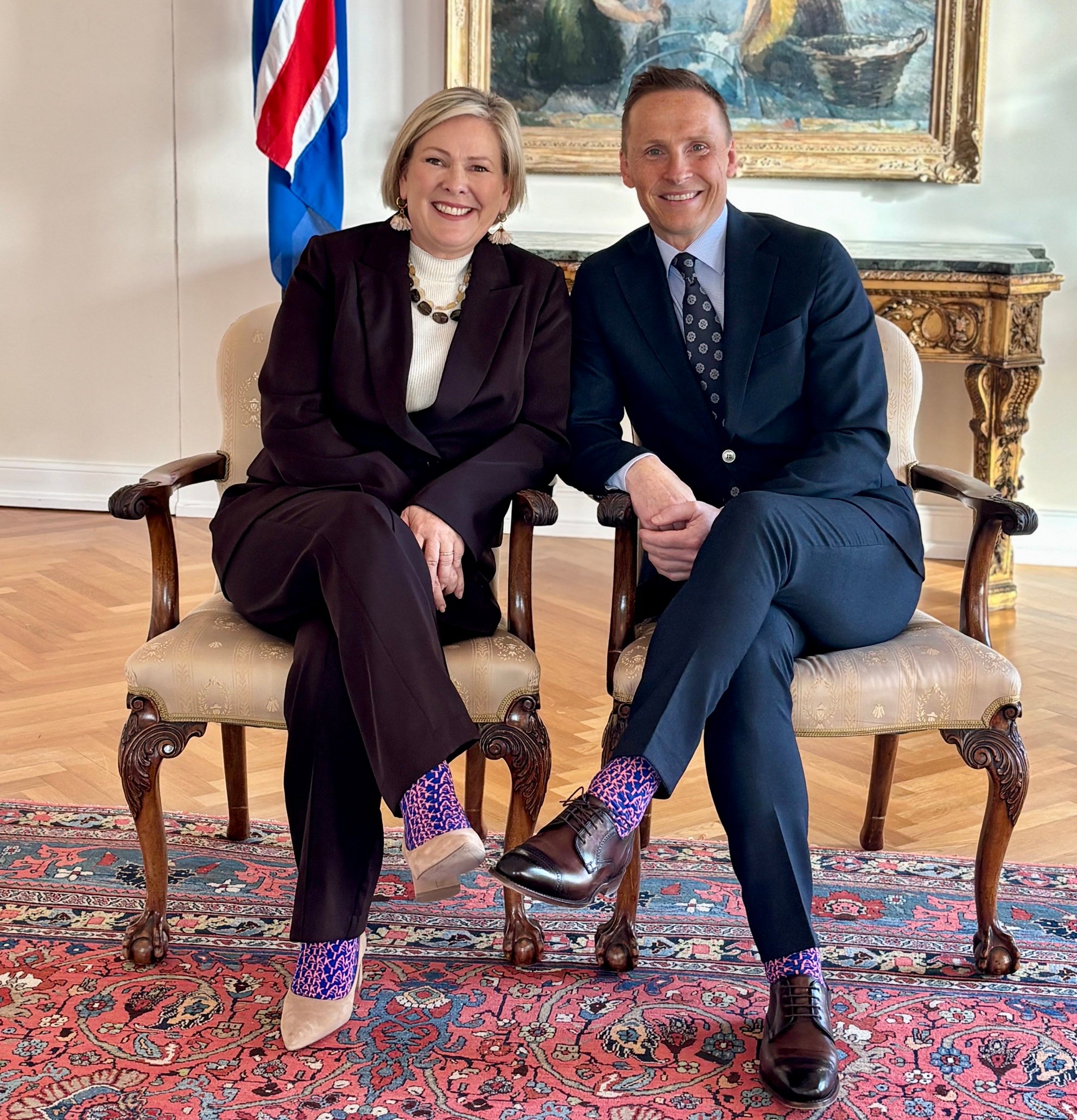Forsetahjón taka við sokkapörum frá Krabbameinsfélaginu.