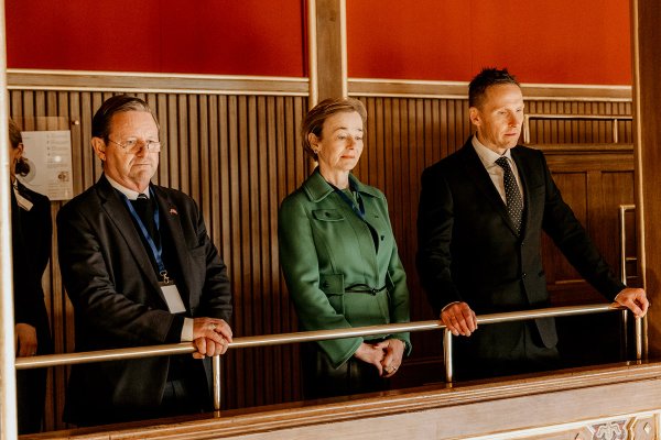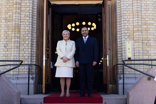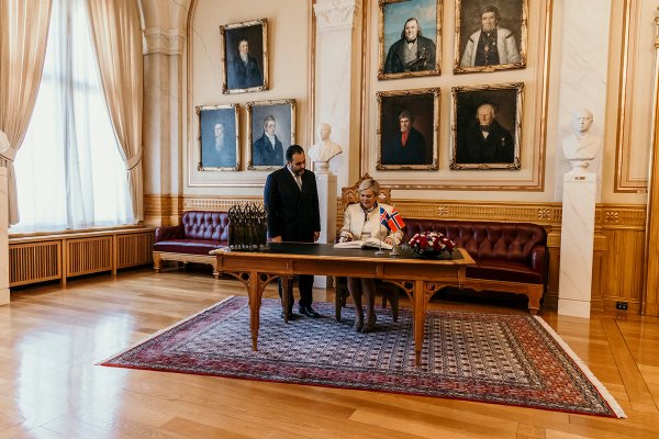 Forseti heimsækir norska Stórþingið og á fund með Masud Gharahkhani, forseta þingsins. Fundinn sat einnig Þorgerður Katrín Gunnarsdóttir utanríkisráðherra auk starfsmanna. Rætt var um stöðu mála á alþjóðasviðinu og náið samstarf Íslands, Noregs og Norðurlanda allra. Gharahkhani leiddi einnig forseta og ráðherra um bygginguna og sagði frá sögu hússins og þingsins. Heimsóknin í Stórþingið var liður í dagskrá þriggja daga ríkisheimsóknar forseta til Noregs, en lesa má nánar um dagskrána hér.