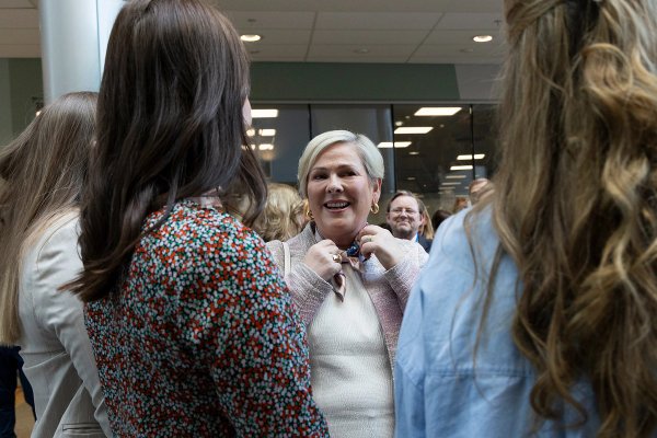 Forseti ræðir við nemendur og starfslið.