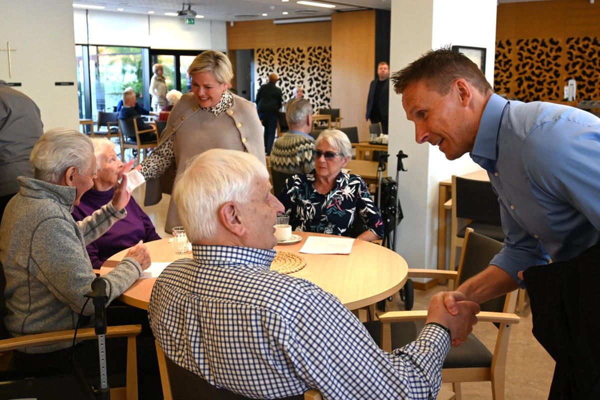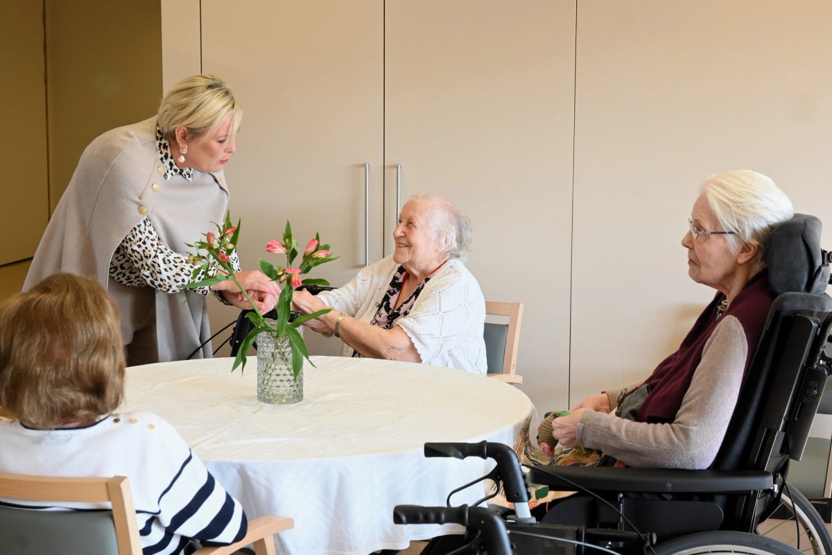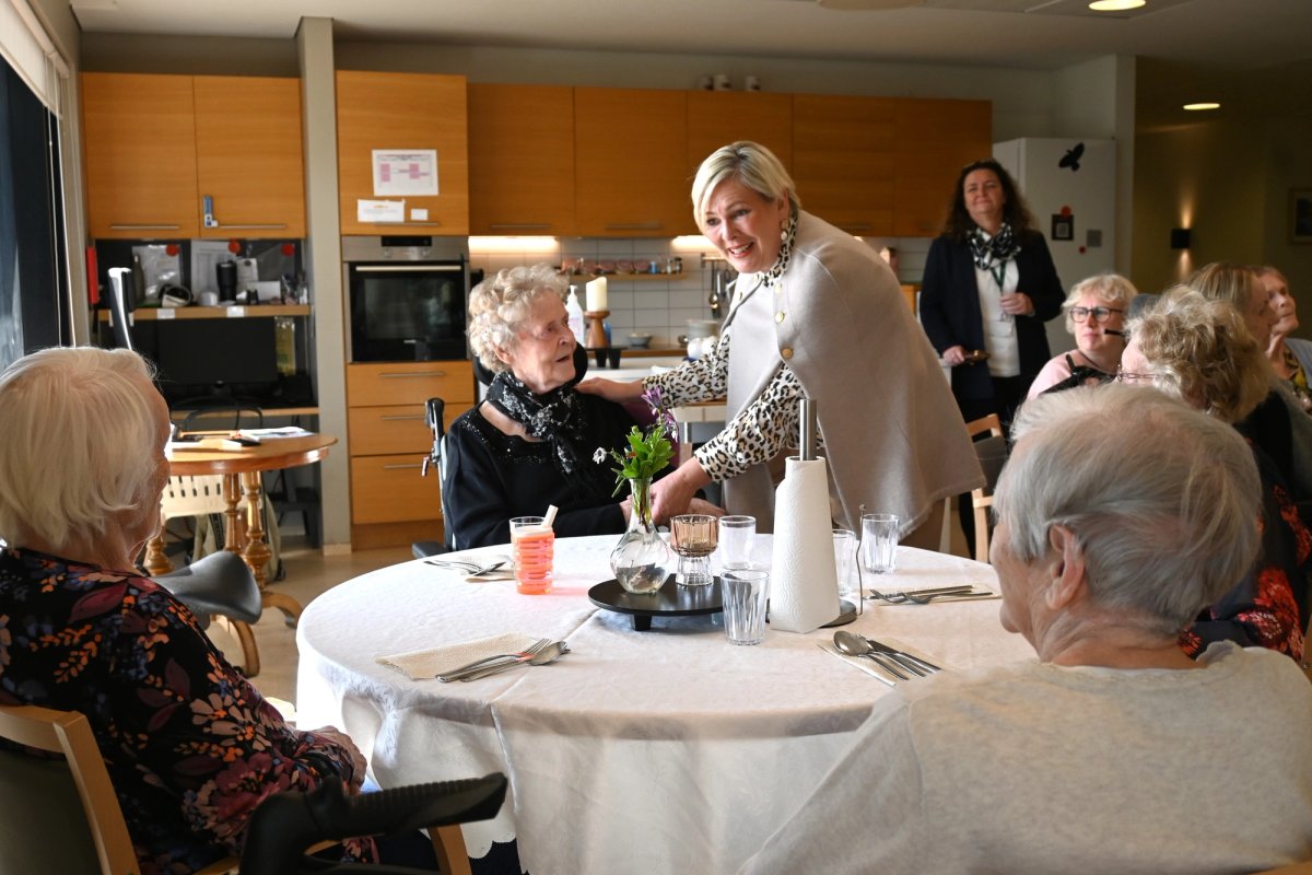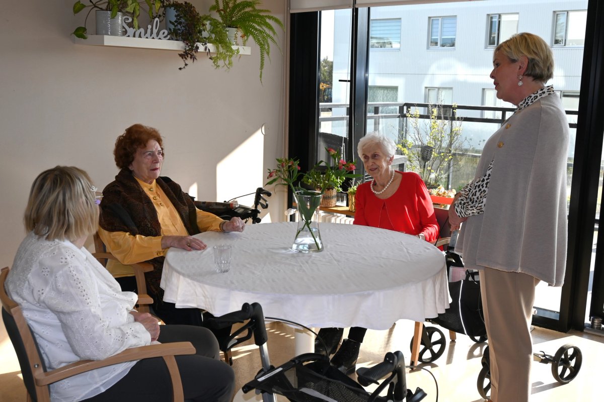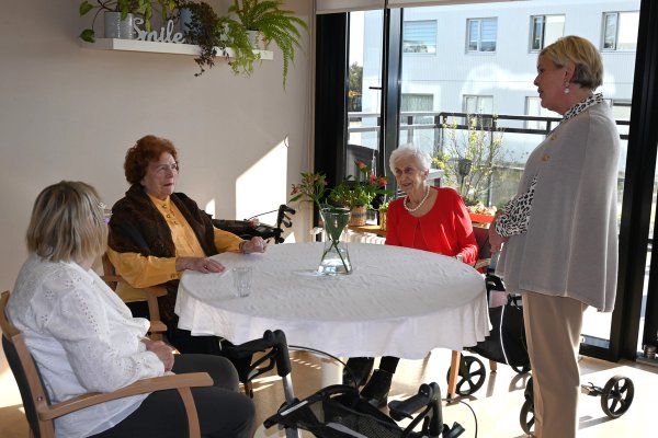 Forsetahjón heimsækja íbúa hjúkrunarheimilis.
