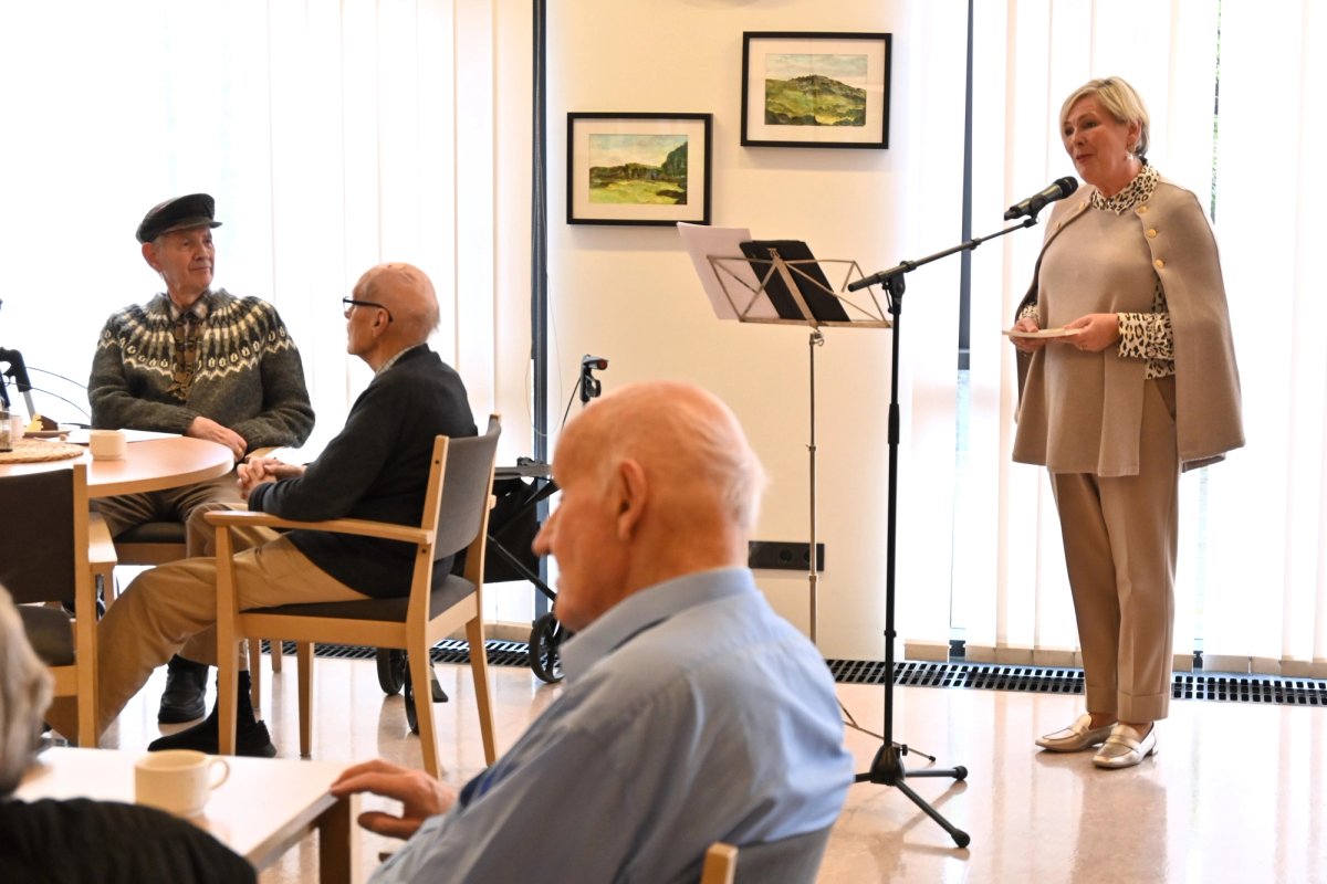 Forsetahjón heimsækja íbúa á hjúkrunarheimilinu Mörk í Reykjavík í tilefni af réttardegi sem þar er haldinn árlega að hausti. Þá gerir heimilisfólk sér glaðan dag í anda fjárleitarmanna en víða um land er fé smalað til rétta um þessar mundir.