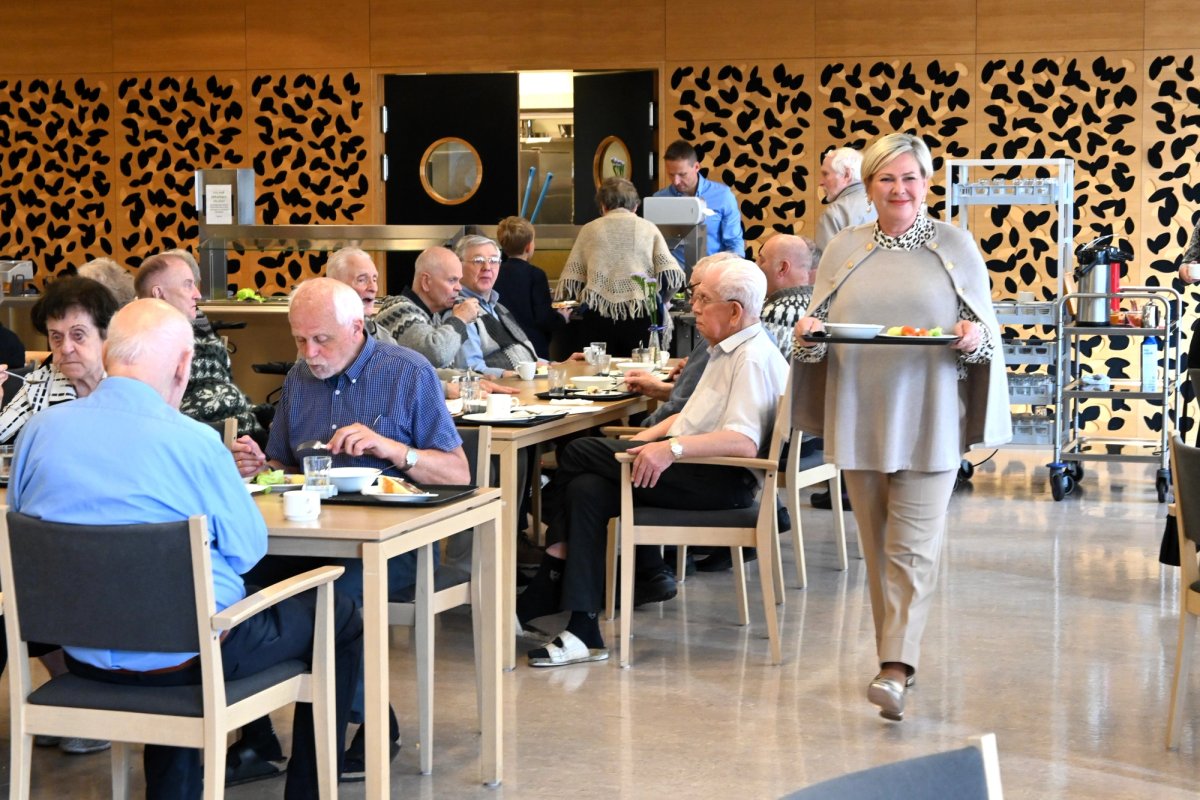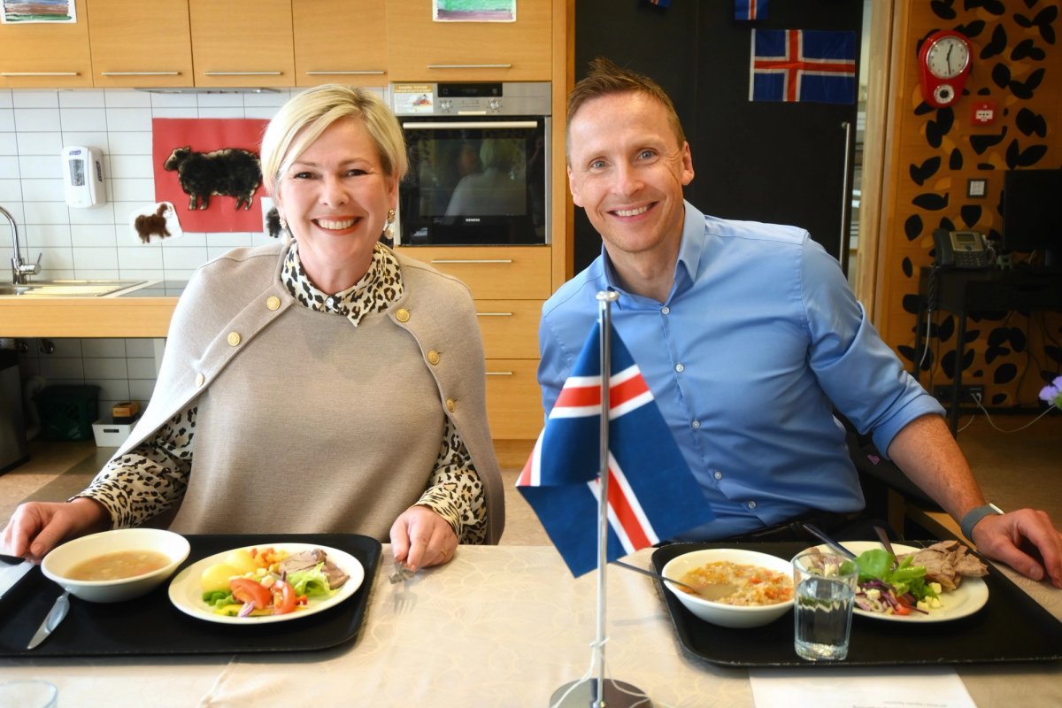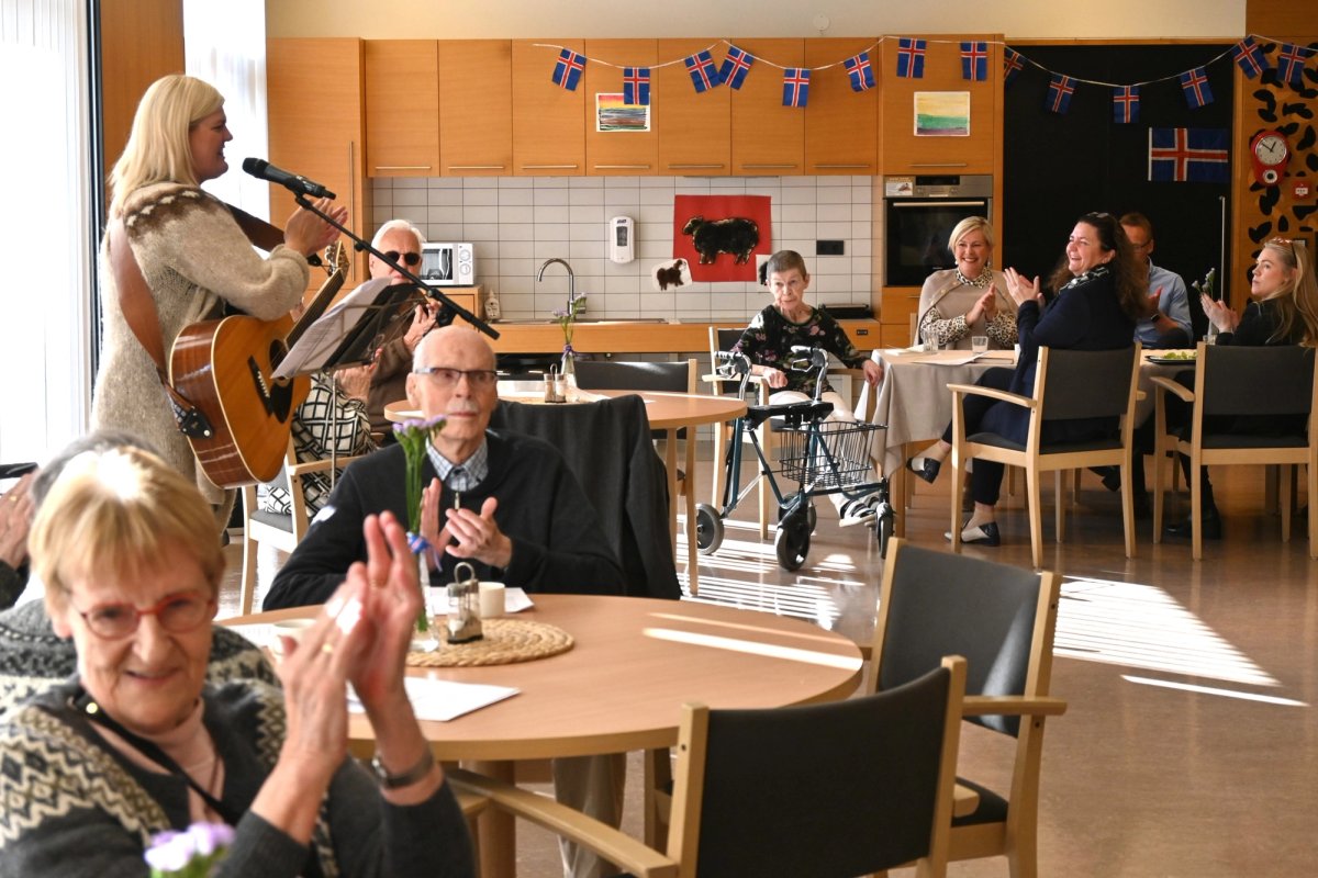 Að því loknu var forsetahjónum boðið að snæða íslenska kjötsúpu á borðsal með íbúum 60 ára og eldri. Forseti ávarpaði salinn og að loknum hádegisverði var svo efnt til hópsöngs við gítarspil þar sem sígild, íslensk dægurlög voru á efnisskránni.