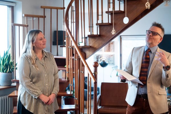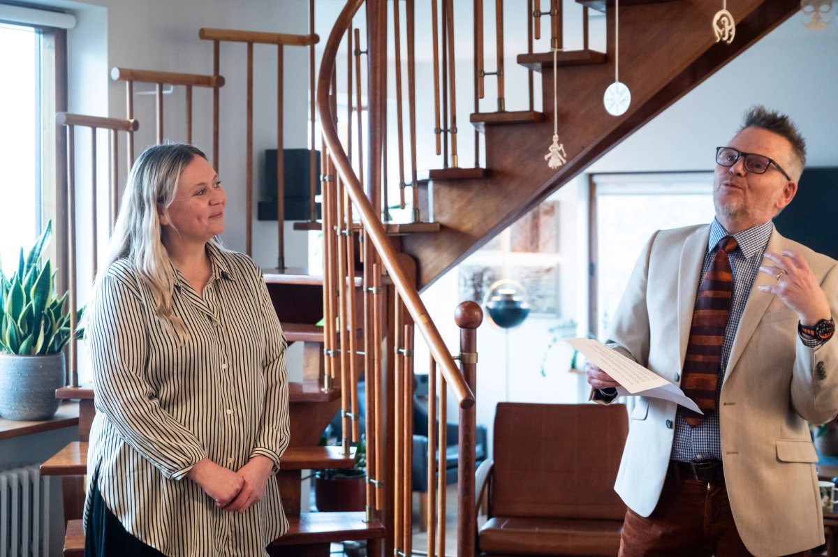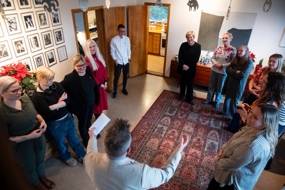 Forseti tekur við bókagjöf frá fulltrúum SÍUNG í Gunnarshúsi. Ljósmynd: Sigtryggur Ari