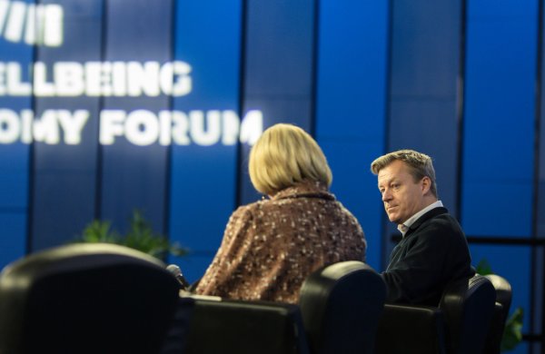 Forseti Íslands, Halla Tómasdóttir, ræddi leiðtogahæfni og velsæld á tímum gervigreindar við Jesper Brodin, fyrrverandi forstjóra IKEA og stjórnarformann B Team á Velsældarþingi 2026 sem fram fór Hörpu 16.-17. apríl.